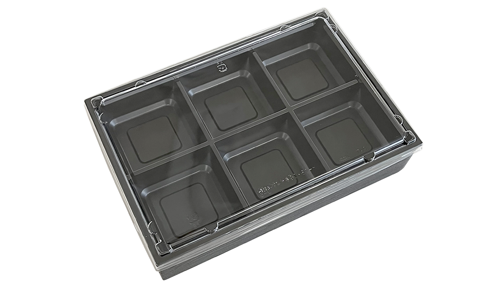 伝統的な木折の美しさと重厚感を表現しながらもプラスチックを使うことで、軽量化や汁漏れを防ぎます。仕切り方は均等ではありませんが4つに仕切られており、盛り付けもしやすくなっております。約180gと約130gのごはんを入れるスペースがございます。
